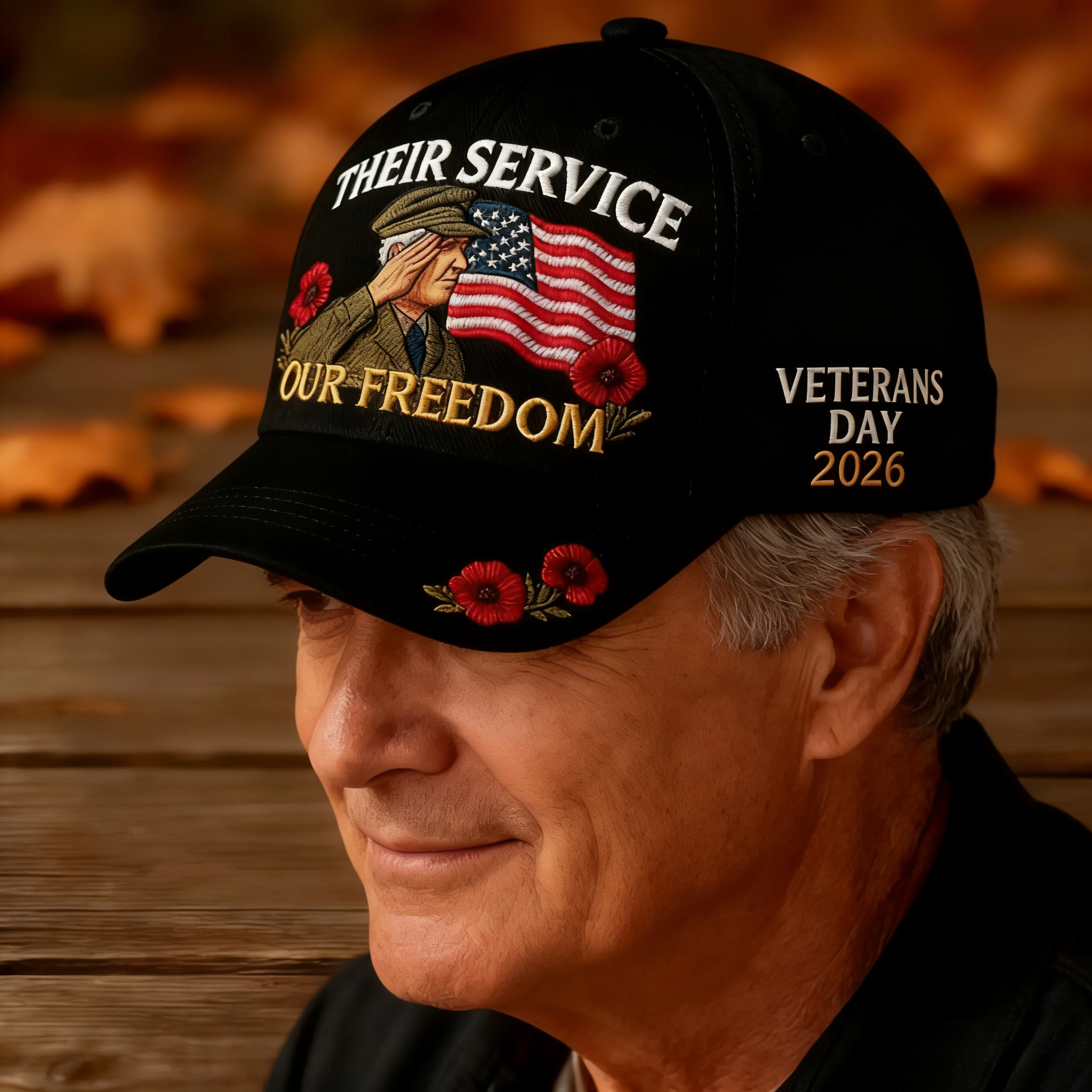Wear your gratitude with pride this Veterans Day! This meticulously crafted baseball cap features a powerful embroidered design of a soldier saluting the American flag, surrounded by remembrance poppies and the words "THEIR SERVICE OUR FREEDOM". Marked with "VETERANS DAY 2026", this limited-edition cap serves as a moving tribute to the brave men and women who defended our freedom.